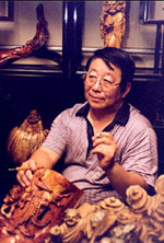 从事根雕的创作是当年的兴趣所在,扎实的美术功底、丰厚的人生经验为“根’的创作打下了牢固的基础。创作中选材十分讲究,如怪本、桤木、红杏、红豆杉等,树龄大多超过百年,曾经为寻奇根,不惜南下,跋山涉水,出于保护自然生态,选材又多采用死去的树根,“化腐朽为神奇”这也正是根雕创作的真谛。多年来创作的上千件根雕作品,题材丰富,其中以历史人物及古典神像为创作对象的系列作品,人物体态自然、古朴,重在写真和神似,细腻的手法,微妙的刻画,使得件件作品都栩栩如生。“海女”、“太白醉酒”、“苏东坡”等都是人物代表作品。颇具特色的群体人物作品如“八仙过海”“十八罗汉”等大型摆件也深受好评。现代题材的根艺作品及装饰作品也是创作题材之一,根艺作品“企盼”正是表达了全国人民期望香港早日回归,祖国能早日统一的迫切心情。