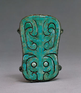 这件器物出土于墓主人的胸部,估计是佩带在身上的佩饰,但从其工艺和纹饰上来看又绝非一般的装饰物,可能代表了墓主人的特殊身份。牌呈长圆形,中间弧状束腰两端各有两个穿孔钮。凸面由许多不同形状的绿松石片嵌成兽面图案。图案组合精巧,极富装饰效果。凹面附有麻布纹。