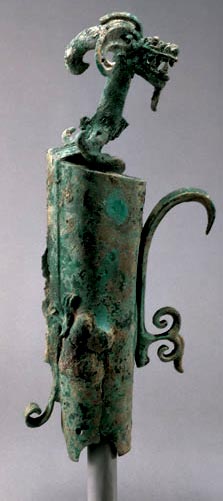 此器应为某种器物上的附件。柱顶铸有一龙,龙口大张,露齿,两前爪趴于柱顶上,身尾下垂于柱侧,两后爪紧抓柱的两侧,尾上卷,龙头上有镰形大耳和犄角各一对。柱壁的另一侧有简化的夔形纹饰。类似的器物配件和饰物在此遗址中还有不少的发现,多以动物形为题材,如虎形器,夔龙形羽翅饰等。