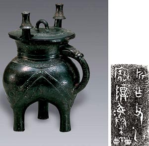 鋬,两柱呈伞状,盖上有双首蛇形半环纽,两侧有半圆形缺口,扣合时以便纳柱。腹部饰双道折线纹,肩饰饕餮纹,以雷纹为地,盖饰斜角雷纹,间以目纹。盖内有铭文2行7字,鋬内有铭文2行8字,记折为父乙铸祭器。