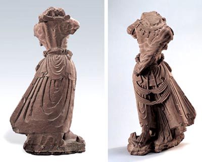 金刚力士,是佛教的护法神。这躯石雕像,虽然头颈部和手臂已有残缺,但从他袒露出的块状肌肉和扭动的身躯,仍可想见其筋肉隆起,须发奋张、怒目圆睁,一手紧握金刚杵,一手握拳做出击之势的凛凛威风。