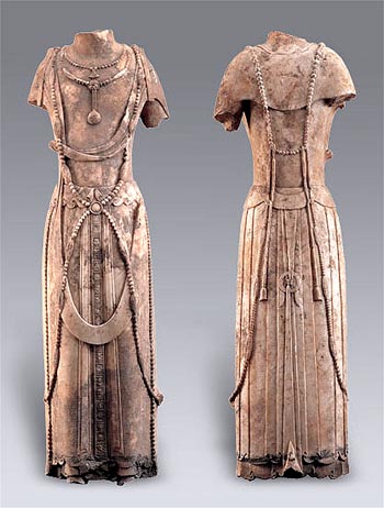 北齐以后,佛教造像流行这种无背屏的圆雕立像。此像为唐代作品,虽也袒裸上身,但胸、腹及臀部股肉丰盈且具弹力感。收腰挺胸,衣裙及帔帛贴体,注重身形的曲线变化。从曲阳修德寺出土的佛教造像,各个时代均以小型像居多,这可能与小型像制作对经济力量有限的下层僧俗信众来说较为容易有关。这两躯大型像其造立目的,安置场等恐怕与其它小型像不同。