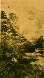 水墨山水以渲染为法,用笔简练奔放,强调水墨效能的发挥,以之来表现景物的体和面。即便设色,也讲究自然清淡,追求含蓄、悠远、纯净的境界,以“画中有诗,诗中有画”为高。如传作王维《雪溪图》平淡天真,感情委婉,十分耐思。